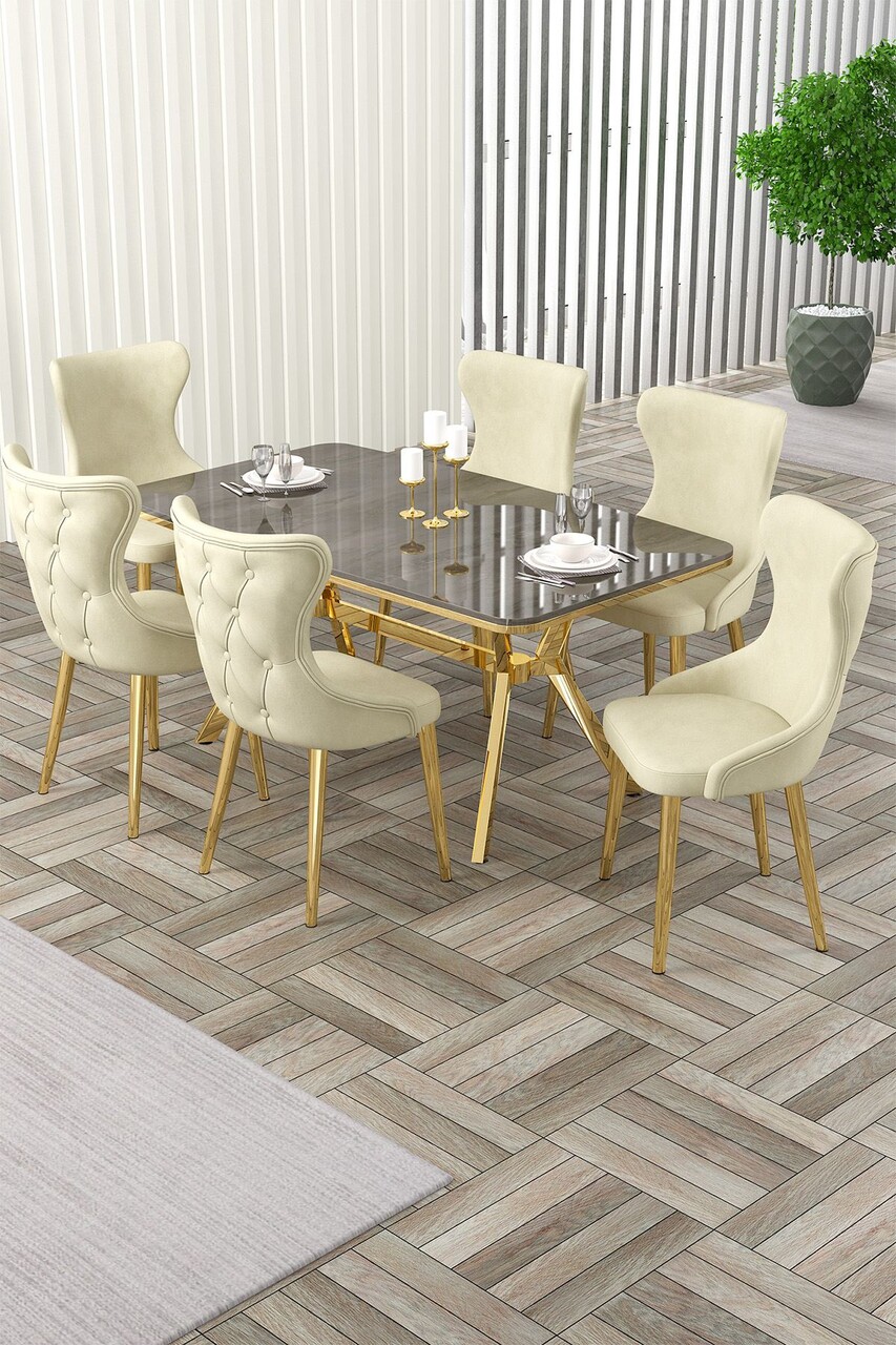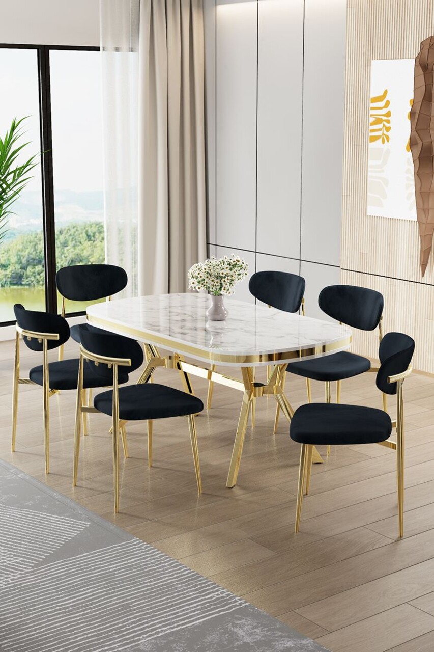 Set masă și scaune (7 piese), Hanah Home, Olya, Marmură neagră / Auriu / Crem