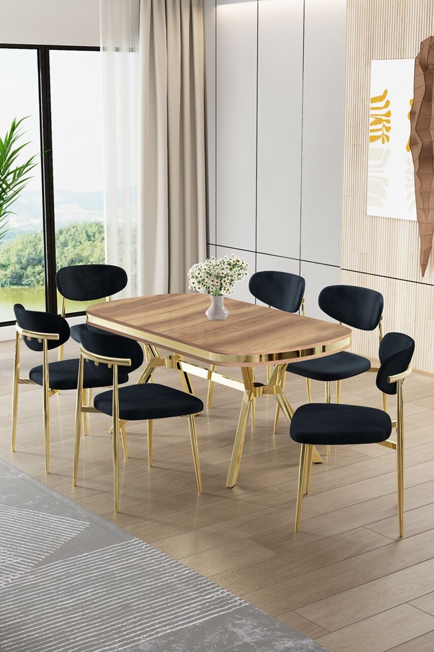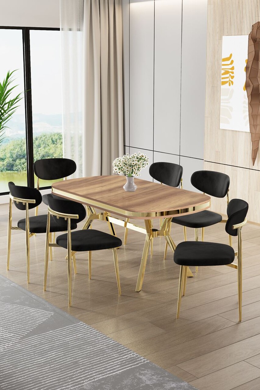 Set masă și scaune (7 piese), Hanah Home, Olya, Stejar / Auriu / Negru