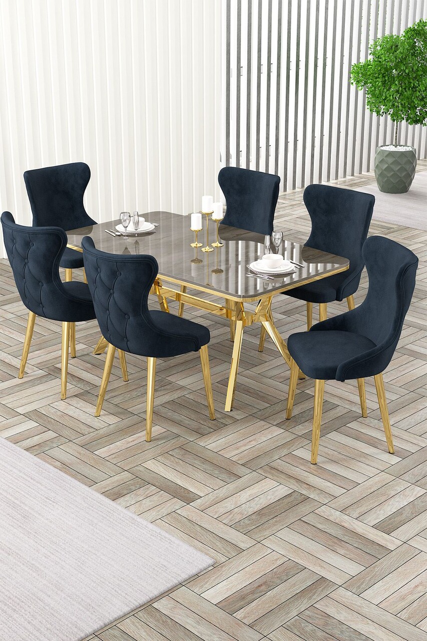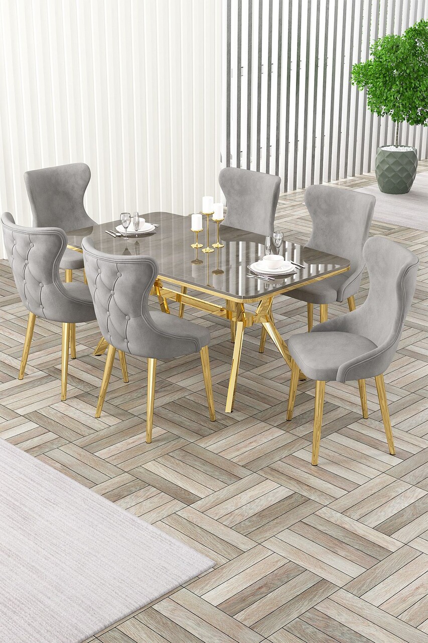 Set masă și scaune (7 piese), Hanah Home, Olya, Marmură neagră / Auriu / Gri