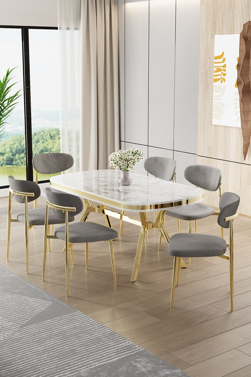 Set masă și scaune (7 piese), Hanah Home, Olya, Marmură albă / Auriu / Gri