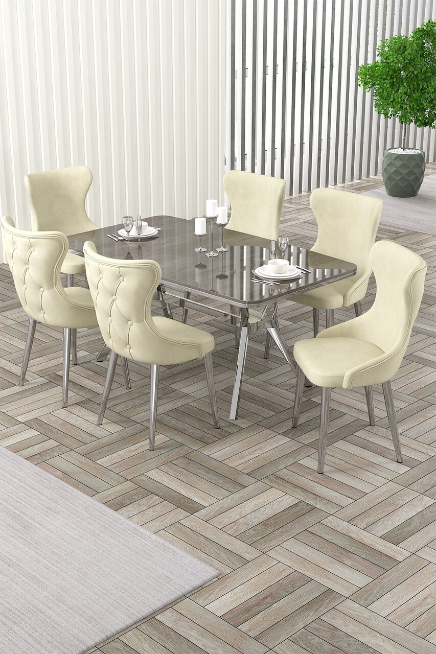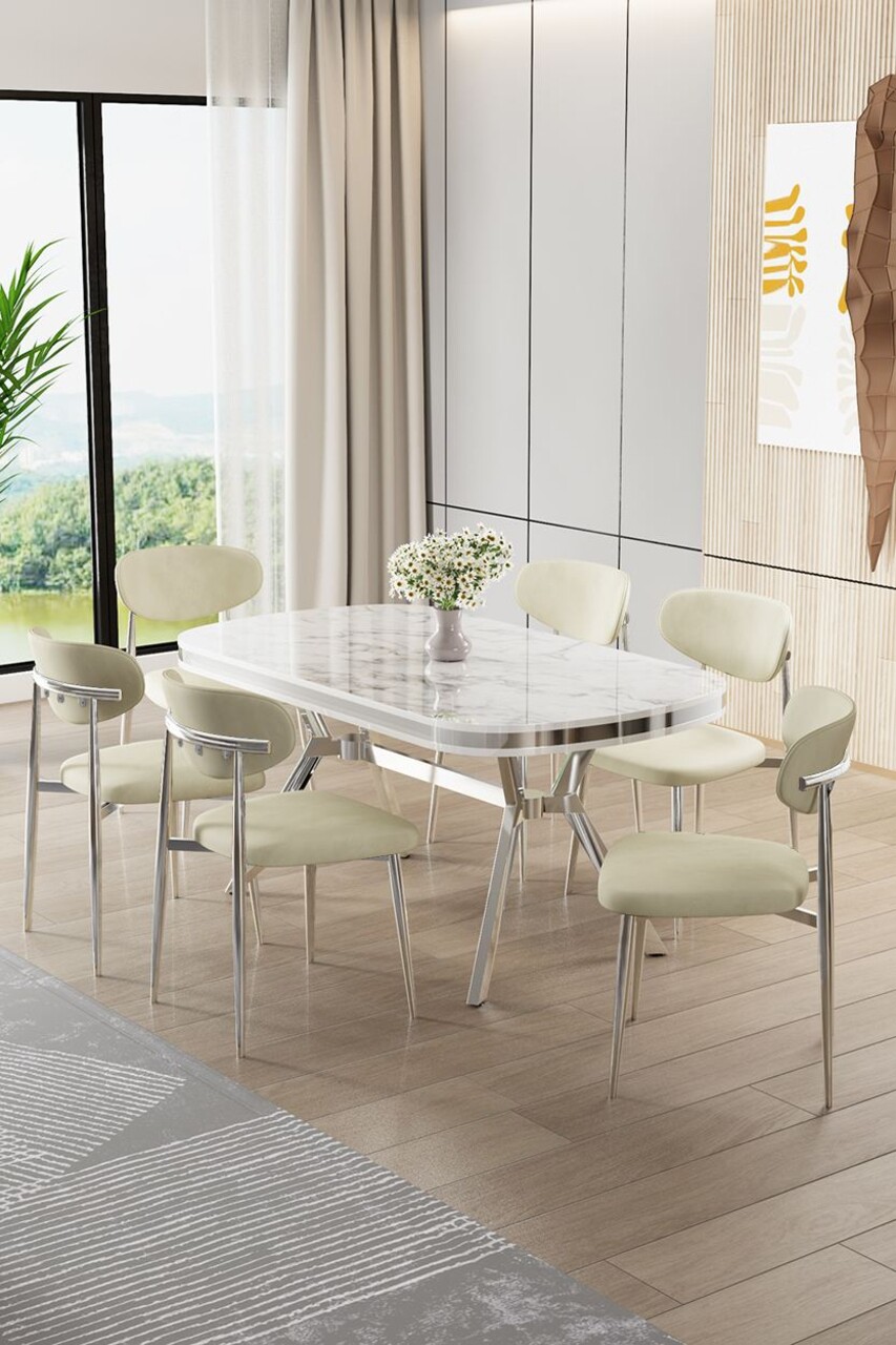 Set masă și scaune (7 piese), Hanah Home, Olya, Marmură albă / Crom / Crem