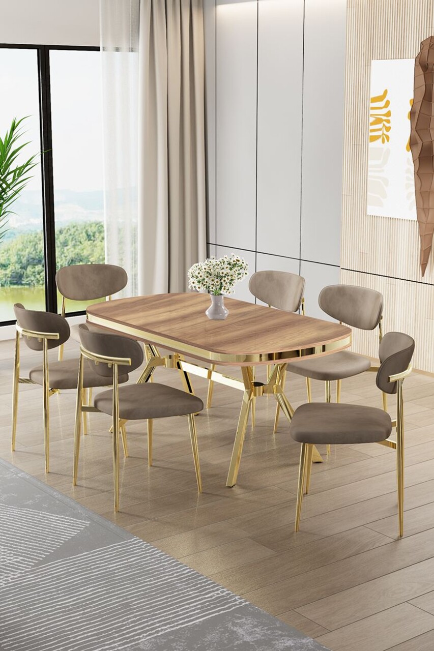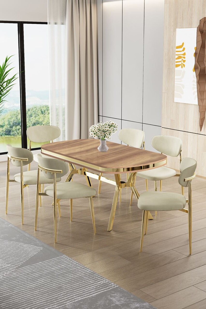 Set masă și scaune (7 piese), Hanah Home, Olya, Stejar / Auriu / Cappuccino