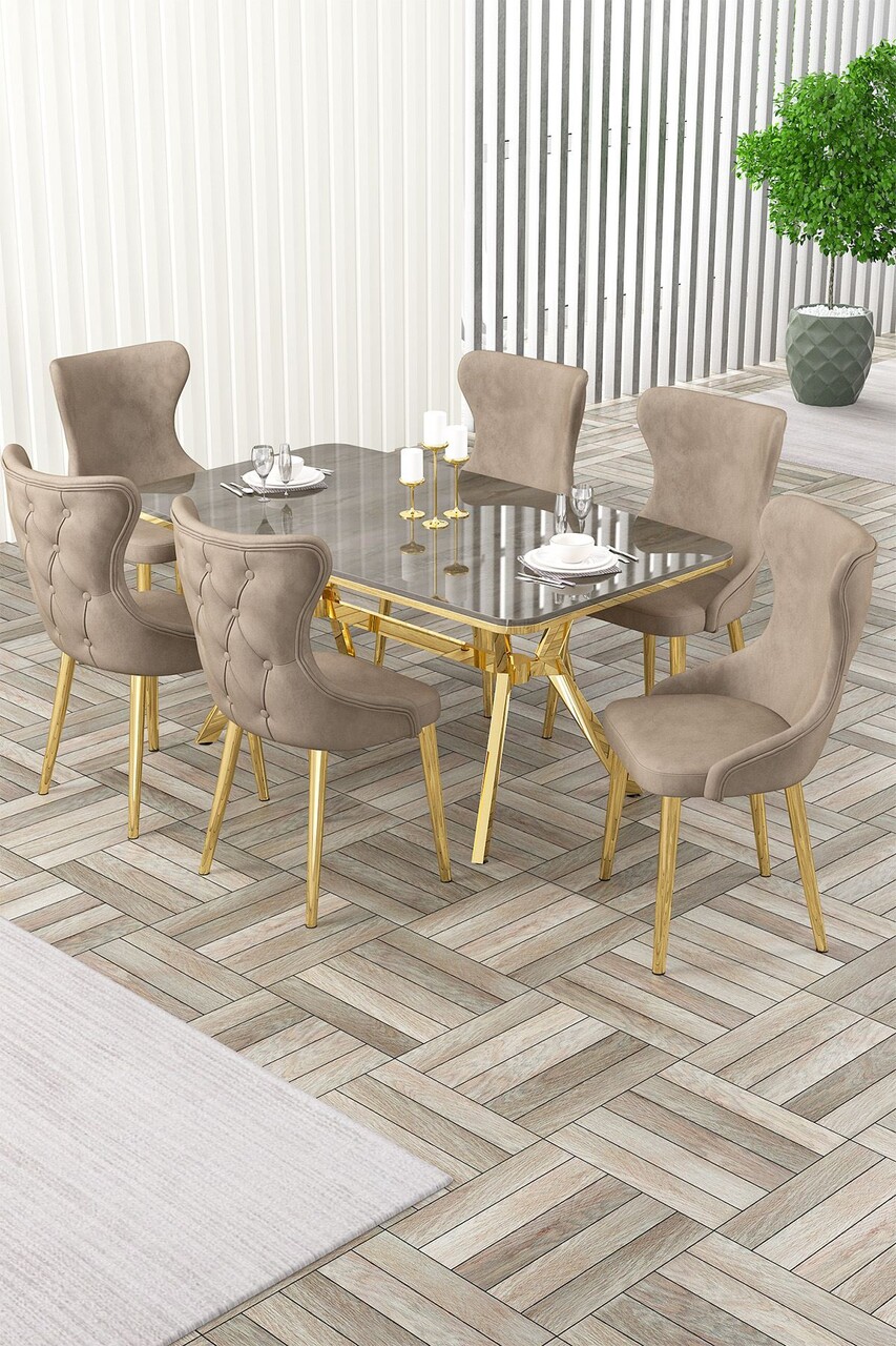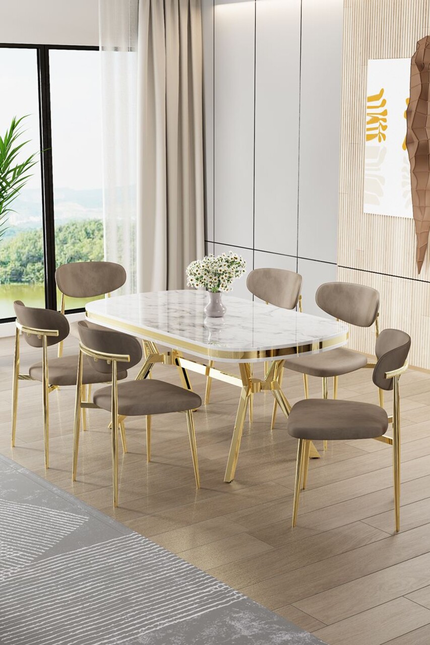 Set masă și scaune (7 piese), Hanah Home, Olya, Marmură albă / Auriu / Cappuccino