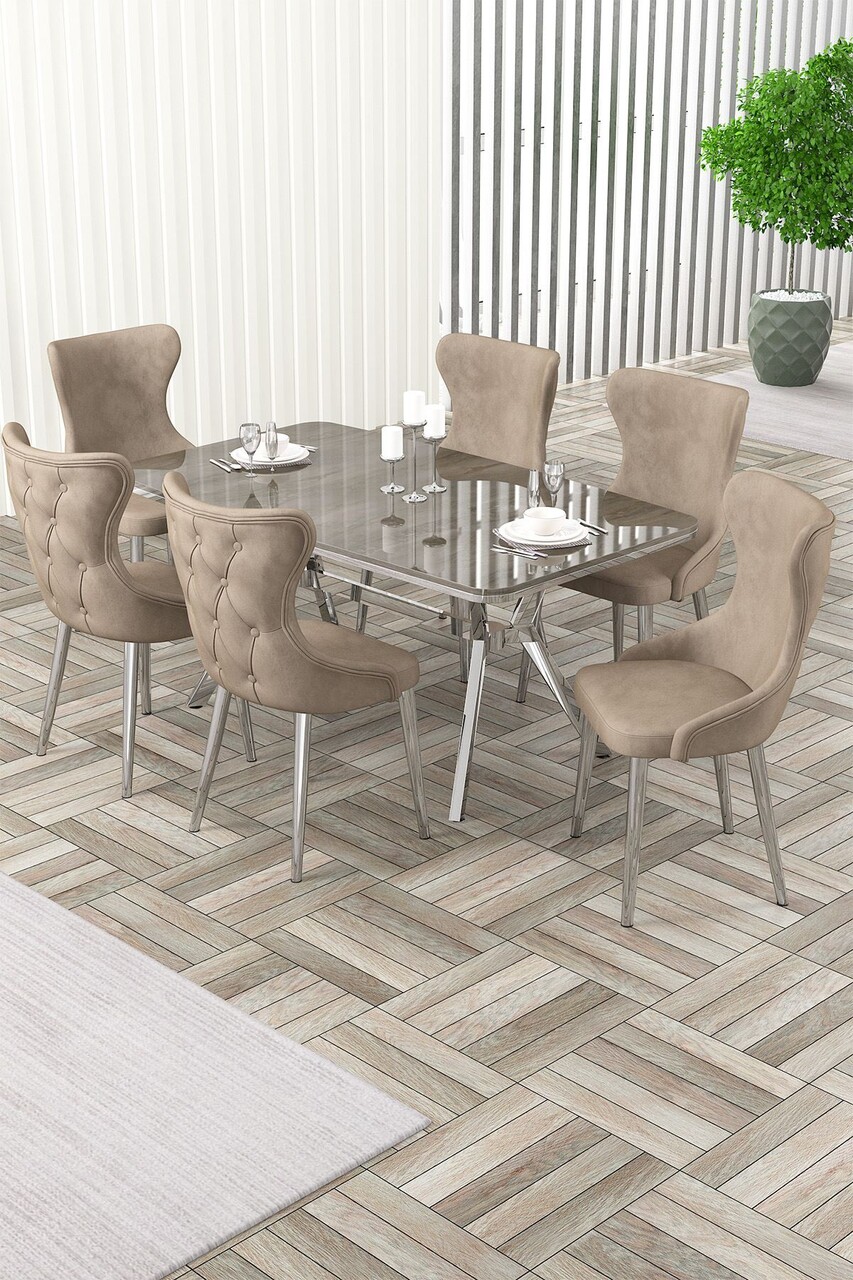 Set masă și scaune (7 piese), Hanah Home, Olya, Marmură albă / Crom / Cappuccino