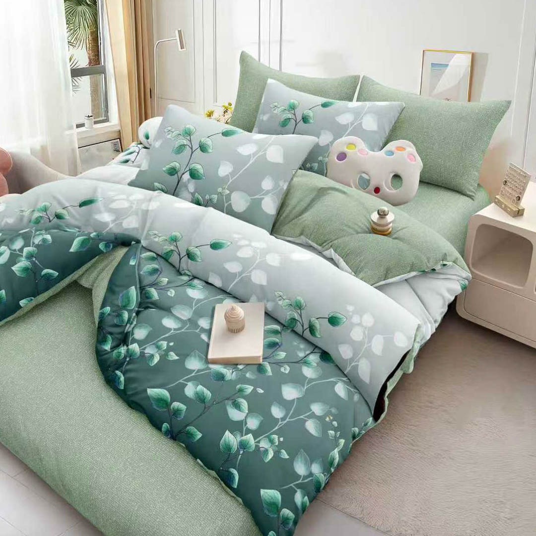 Lenjerie pat dublu cu ELASTIC, Finet, 6 piese, Verde, frunze