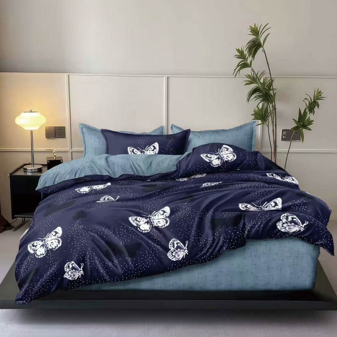 Lenjerie pat dublu cu ELASTIC, Finet, 6 piese, Albastru, fluturi