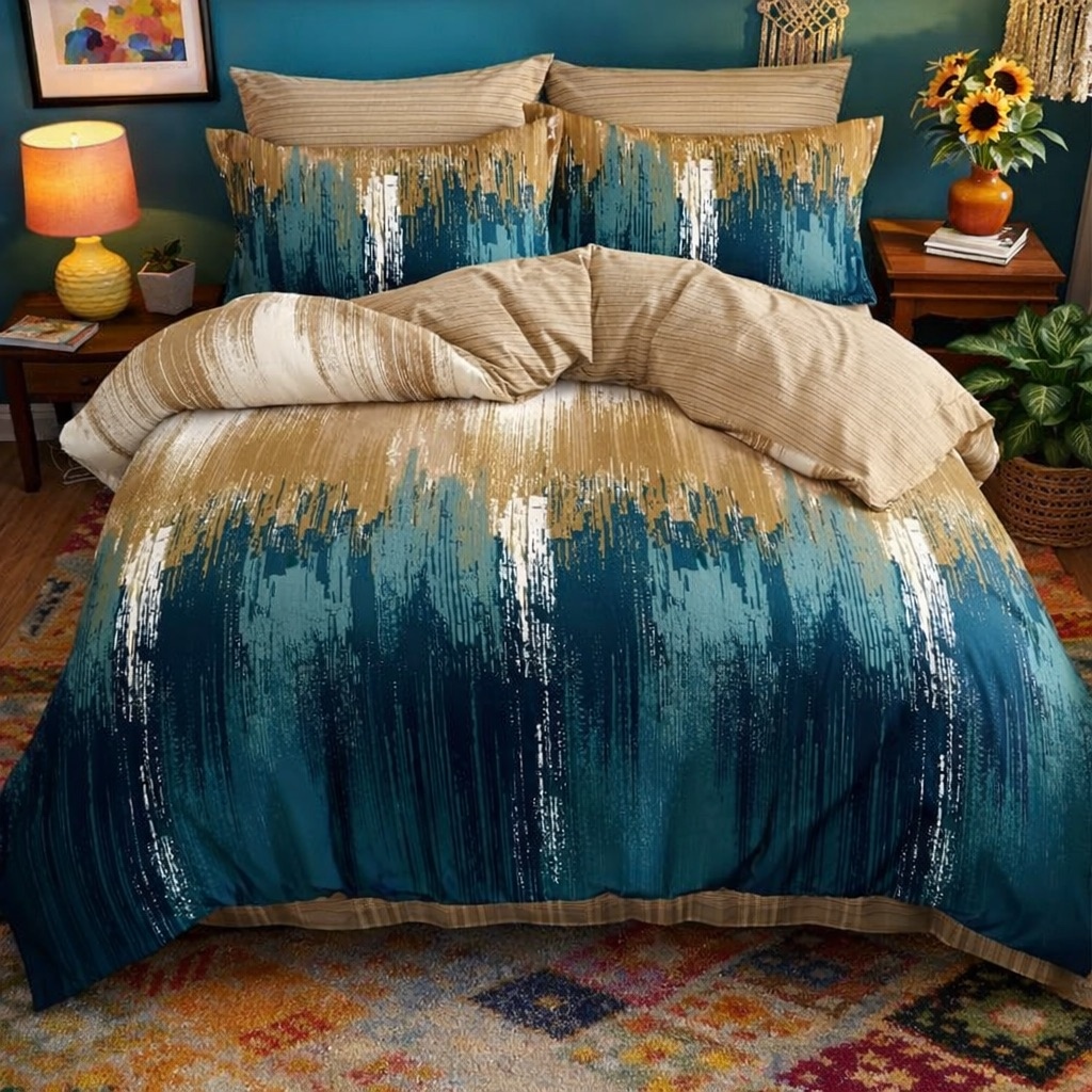 Lenjerie pat dublu, Finet, 6 piese, Albastru Aqua, valuri abstracte, perle