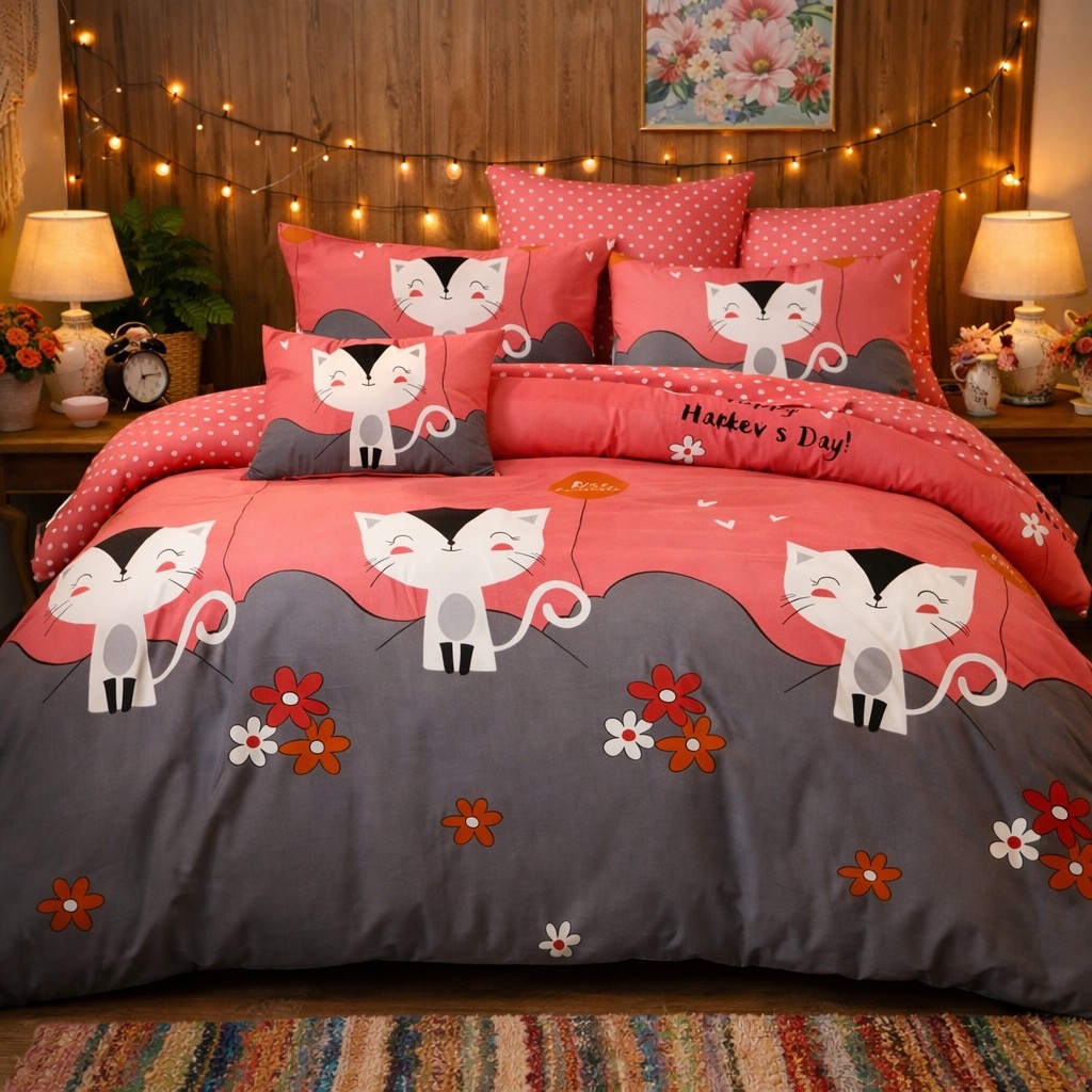Lenjerie pat dublu, Finet, 6 piese, Gri-Roz, pisici, flori