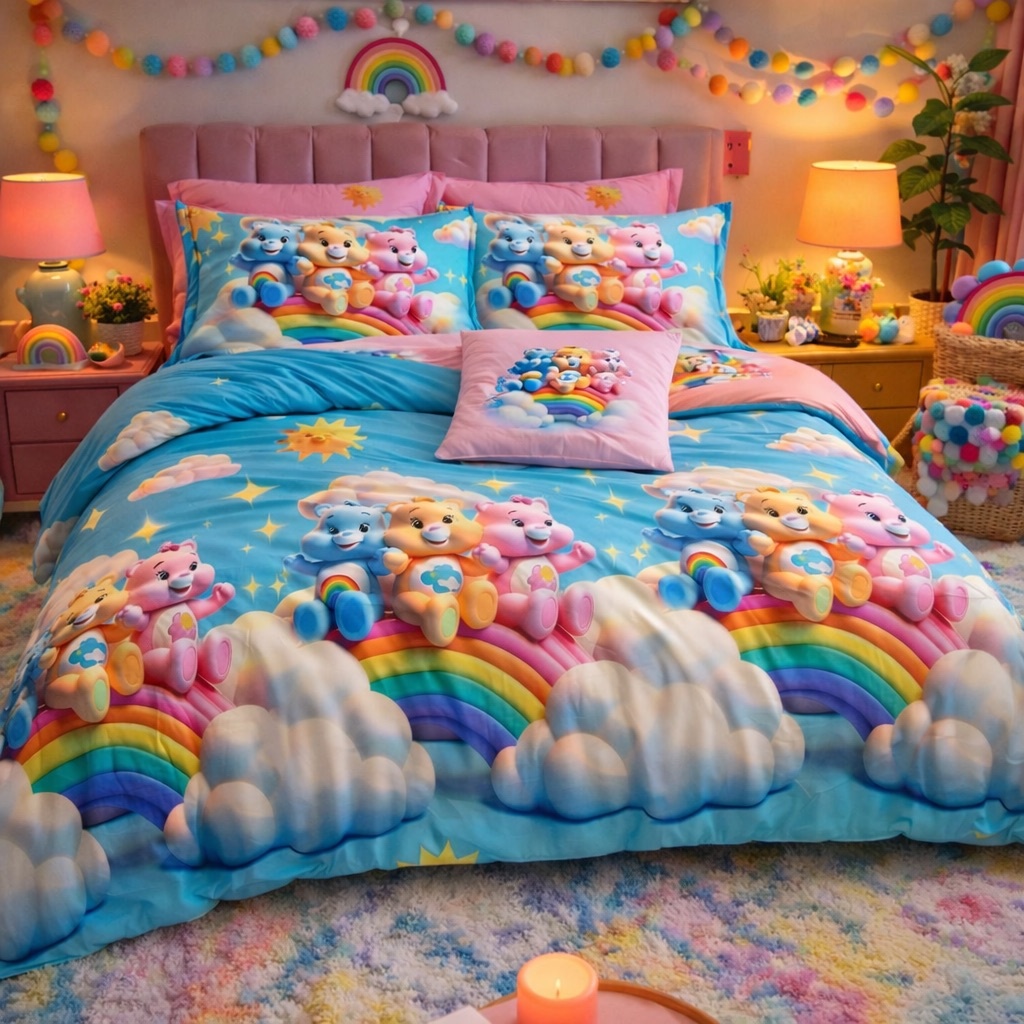 Lenjerie pat dublu, Finet, 6 piese, Bleu, Roz, ursuleti, curcubeu