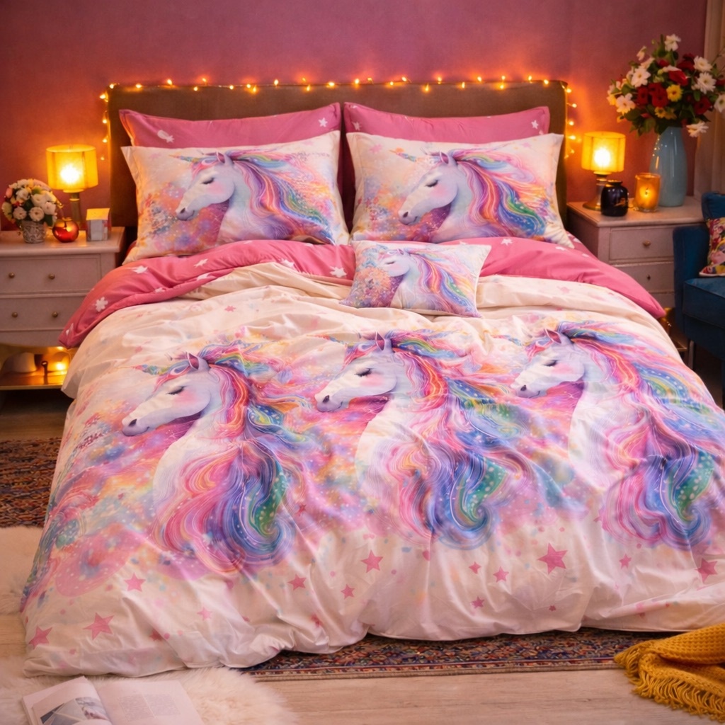 Lenjerie pat dublu, Finet, 6 piese, Roz, unicorni