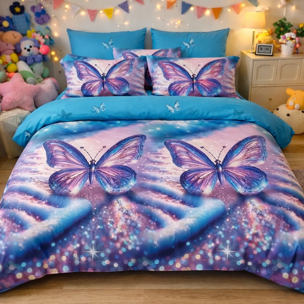 Lenjerie pat dublu, Finet, 6 piese, Mov, fluturi