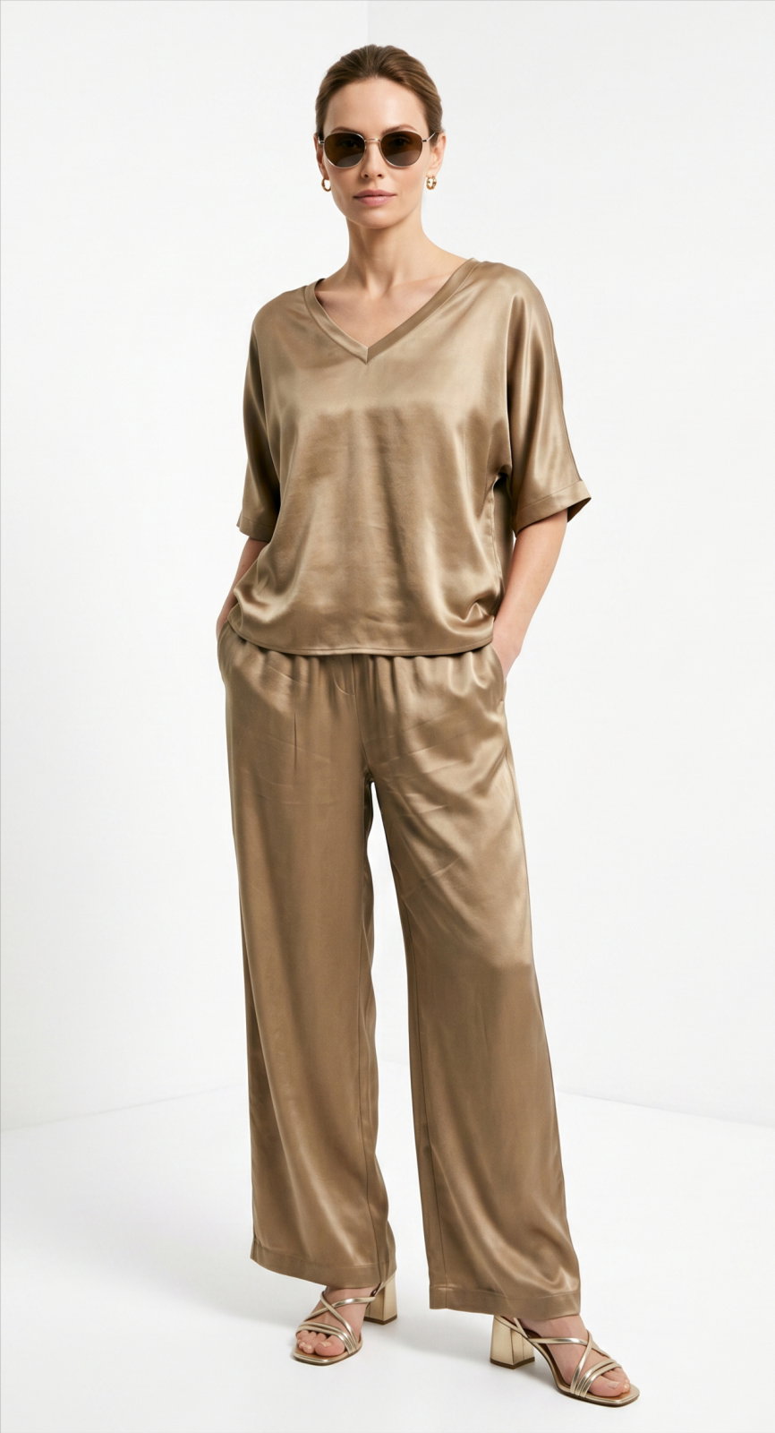 Compleu cu pantaloni, din vascoza, cu aspect lucios satinat, auriu Talie unica