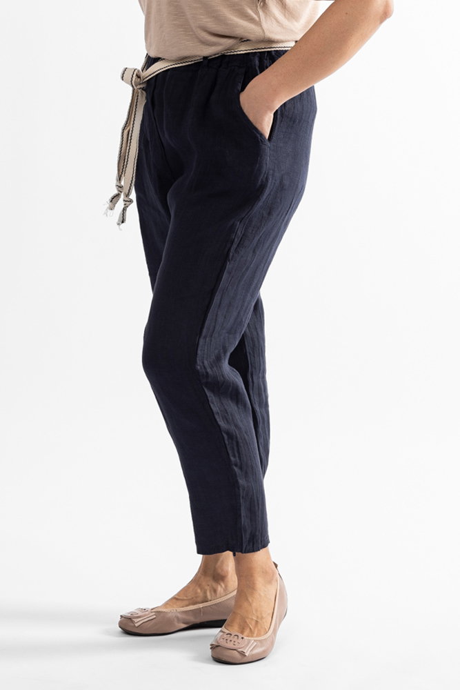 Pantaloni bleumarin din in, pana, cu snur alb Talie unica