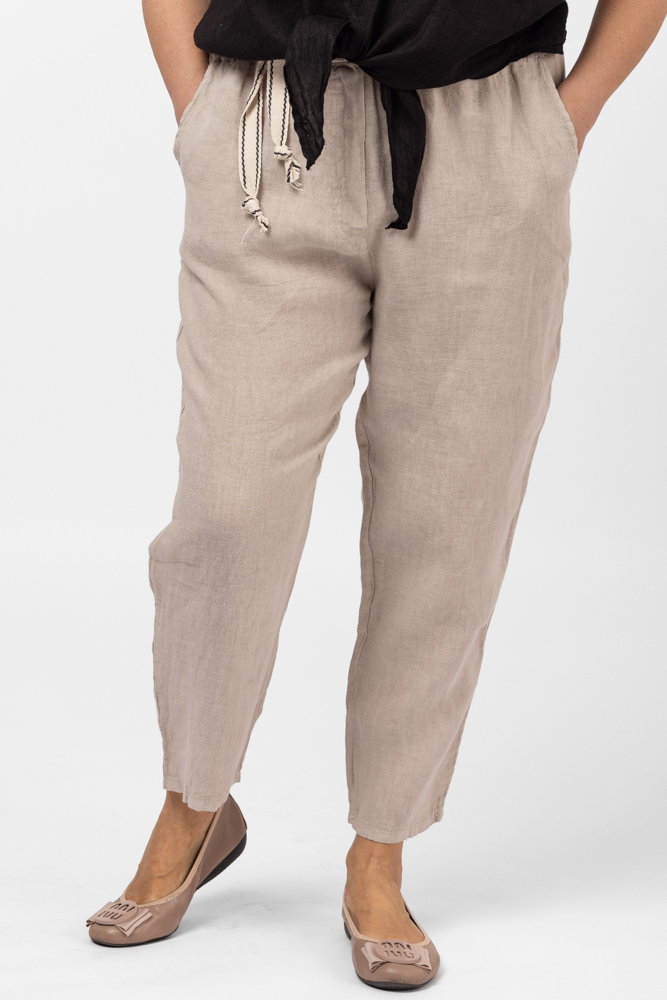 Pantaloni bej din in, pana, cu snur alb Talie unica
