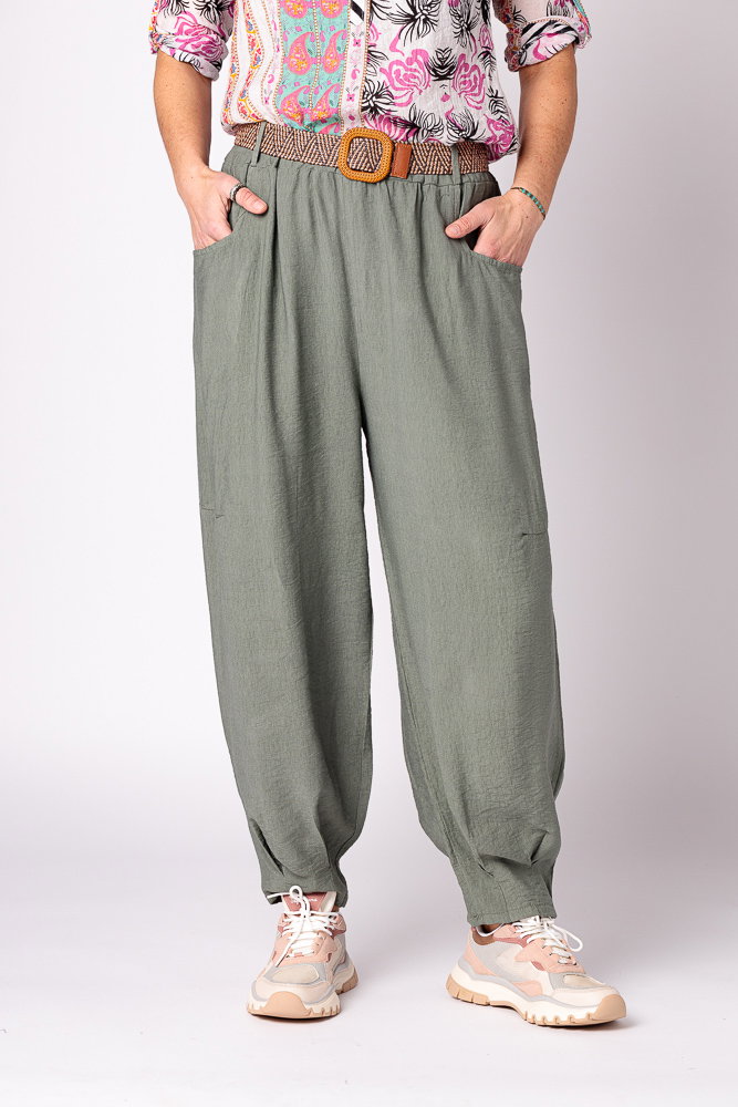 Pantaloni largi de vara, din in kaki cu croi lejer si curea din sfoara Talie unica