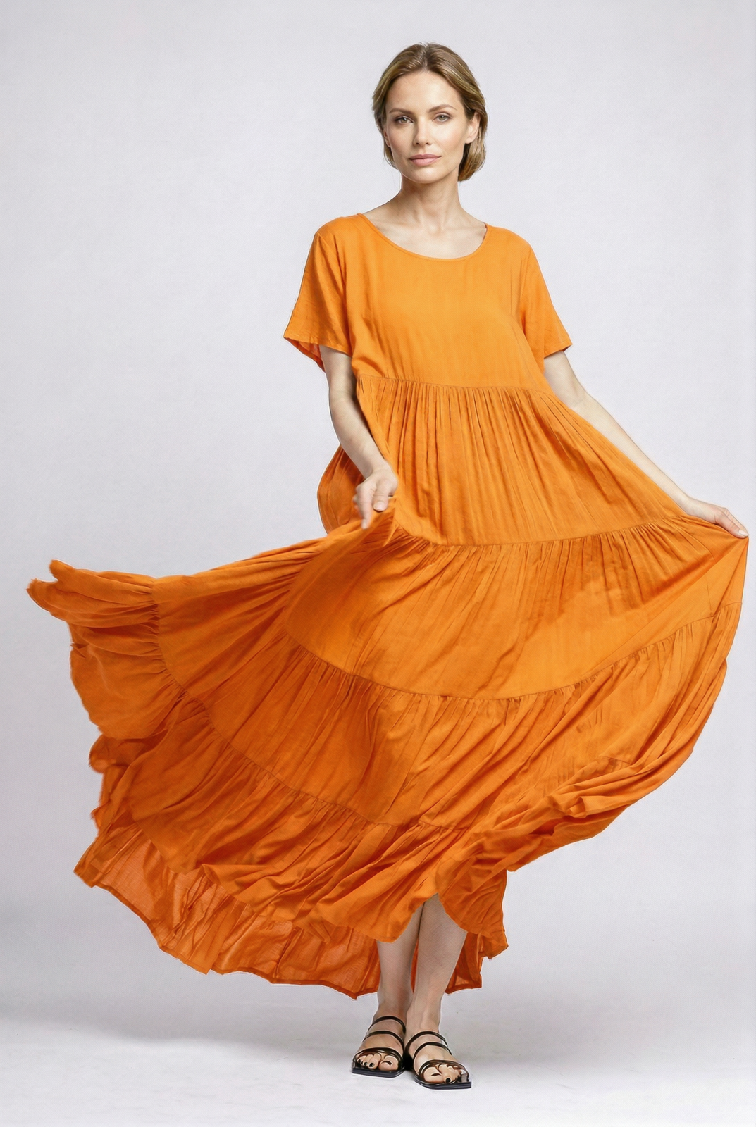 Rochie lunga, croi amplu cu patru volane, stil boem elegant, portocalie Talie unica