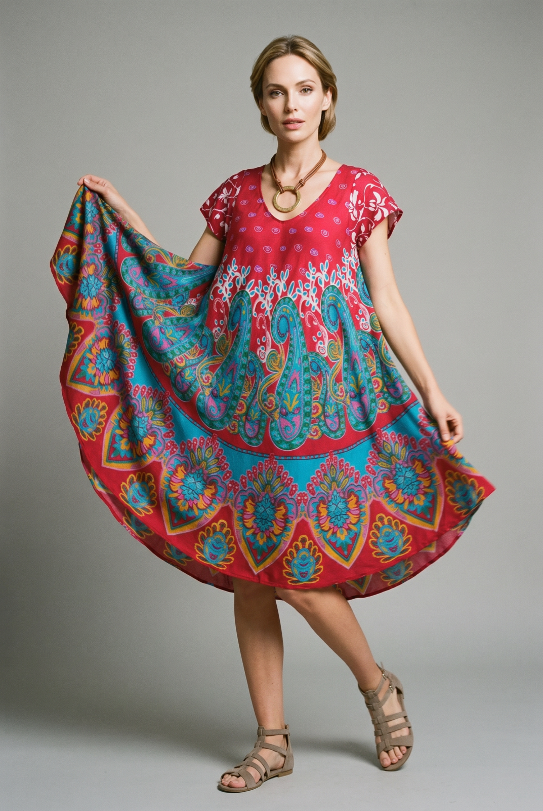Rochie midi A-line cu imprimeu paisley, pe fond turcoaz Talie unica