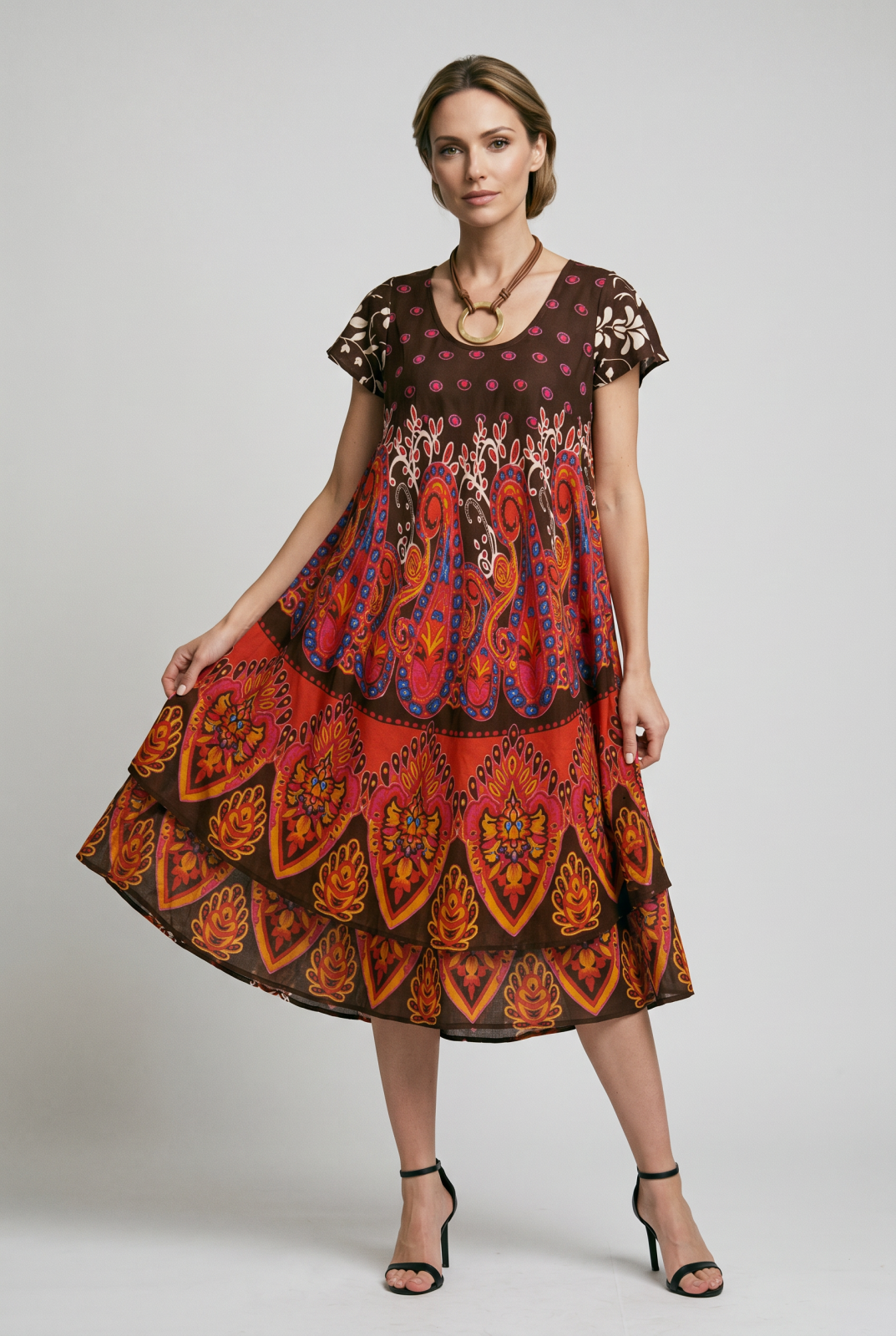 Rochie midi A-line cu imprimeu paisley, pe fond maro Talie unica
