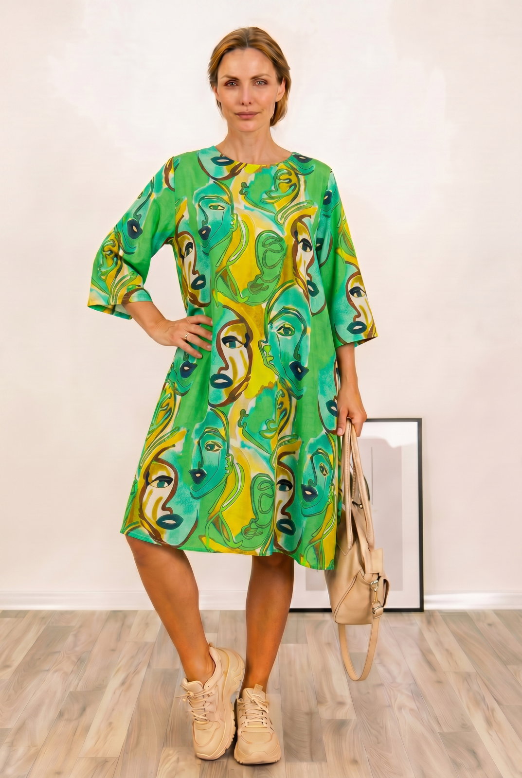 Rochie midi A-line din vascoza cu imprimeu chipuri stilizate, pe fond verde Talie unica