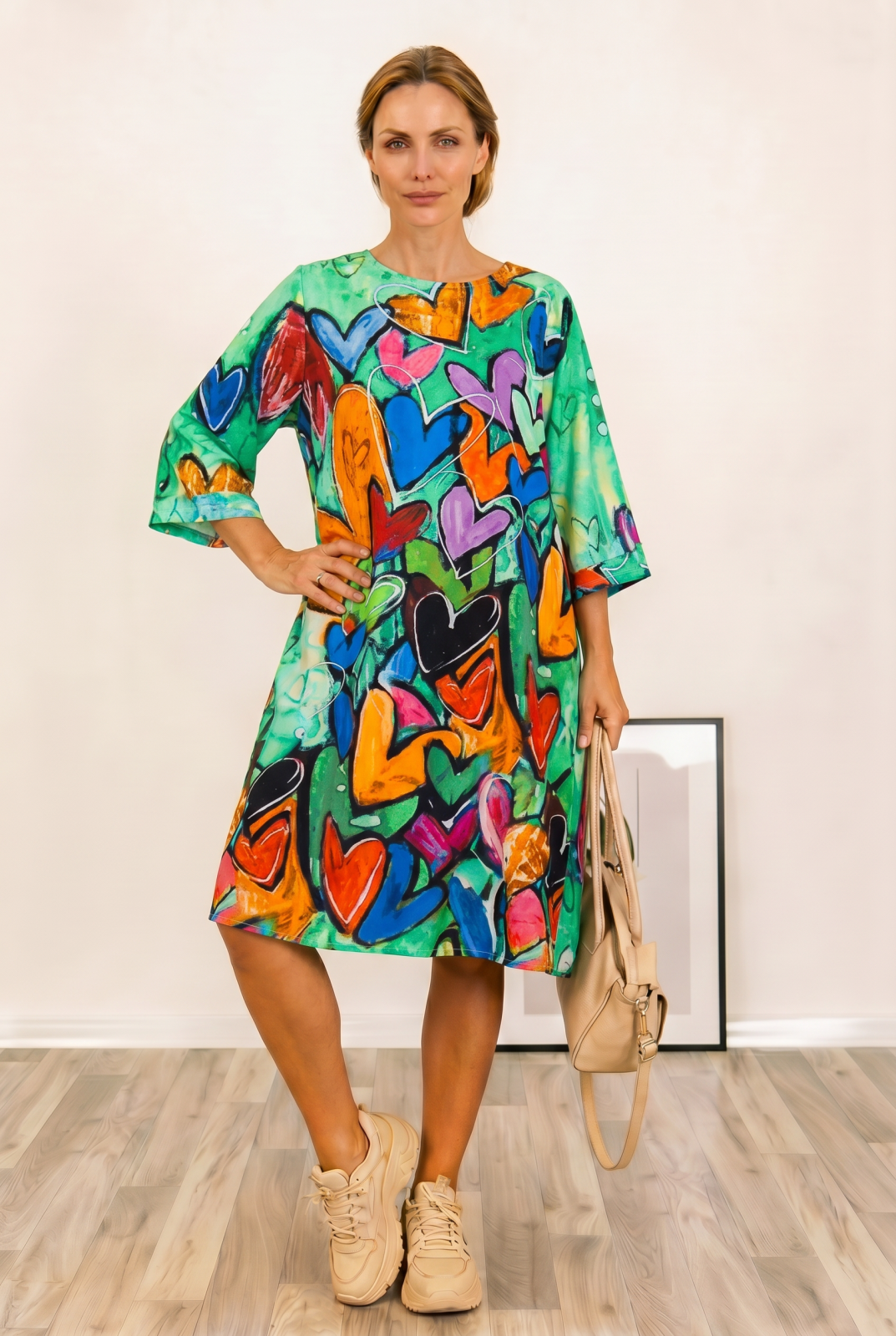Rochie midi A-line din vascoza cu imprimeu inimi pe fond verde Talie unica