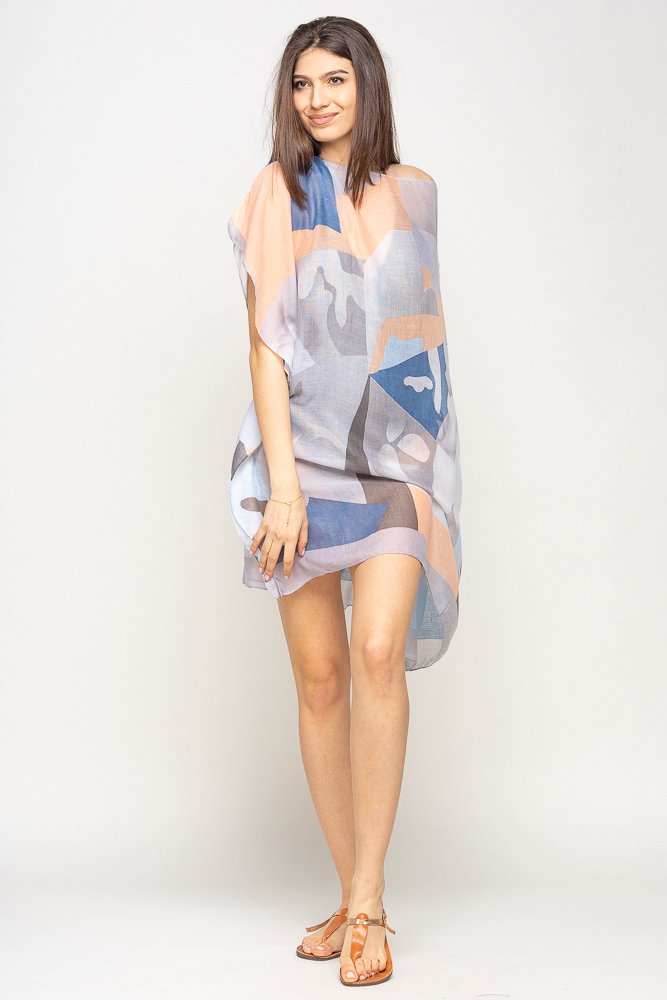 Rochie de plaja tip poncho cu model abstract in nuante de albastru jeans, portocaliu si gri , vascoza Talie unica