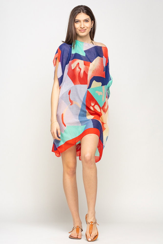 Rochie de plaja tip poncho cu model abstract in nuante de rosu, albastru si verde, vascoza Talie unica