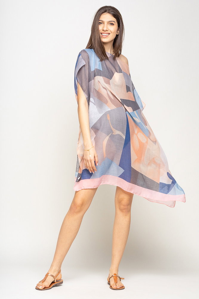 Rochie de plaja tip poncho cu model abstract in nuante de roz, albastru si gri, vascoza Talie unica