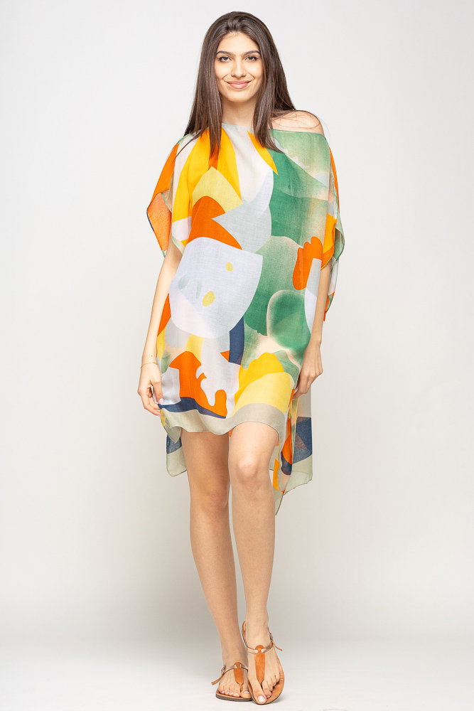 Rochie de plaja tip poncho cu model abstract in nuante de portocaliu, galben si verde, vascoza Talie unica