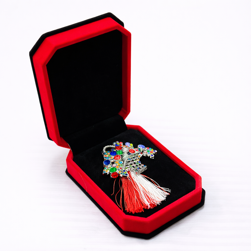 Brosa Cosulet cu pietre multicolore si snur alb-rosu in Cutie de Catifea