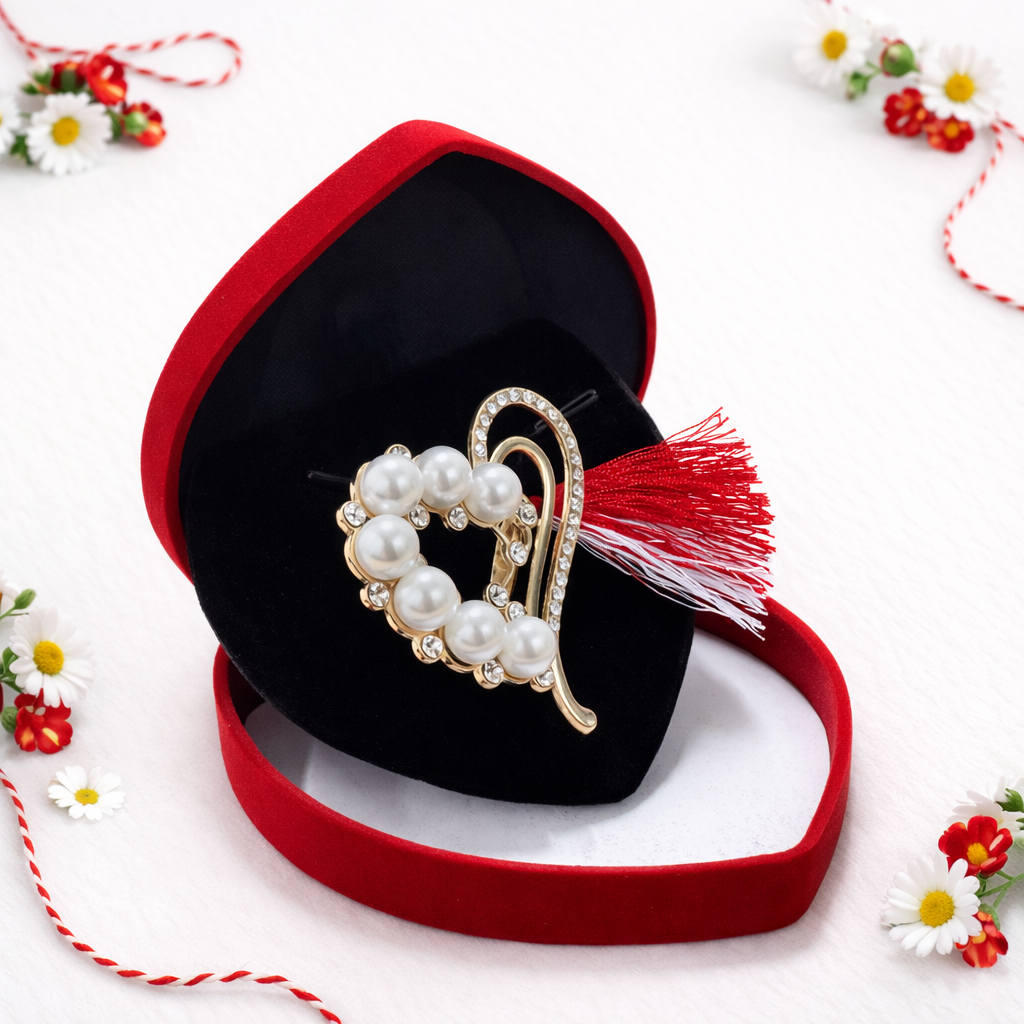Brosa Martisor Inima cu Perle si Snur Alb-Rosu Cutie Catifea