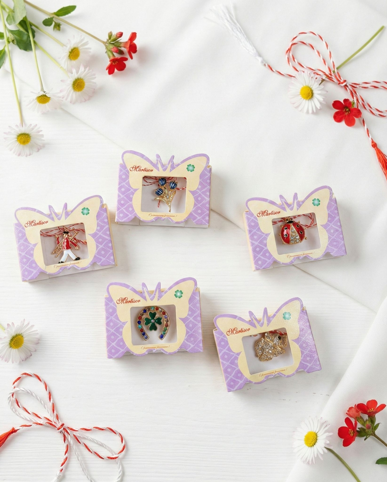 Set 24 brose martisor figurine decorative, ambalate in cutie individuala