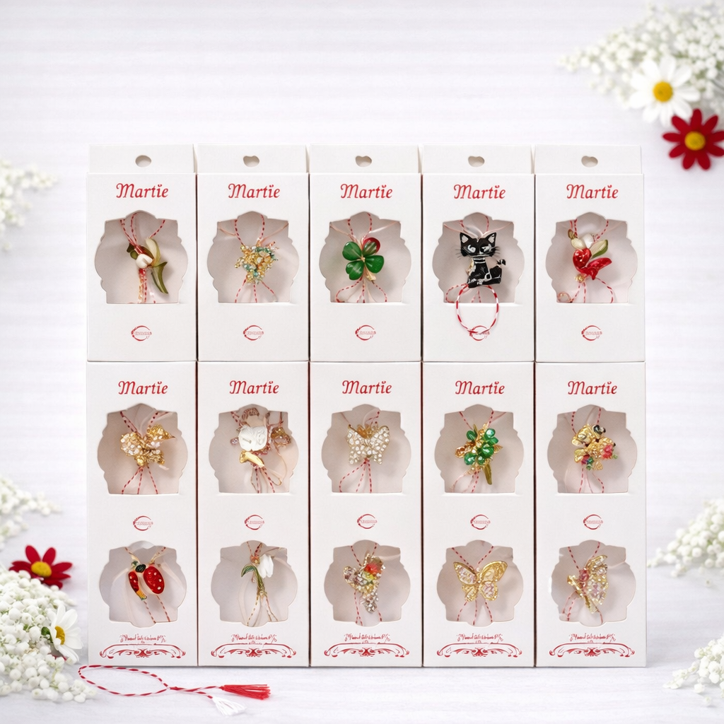 Set 20 brose martisor marime medie, modele variate, ambalaj individual elegant 12x6cm