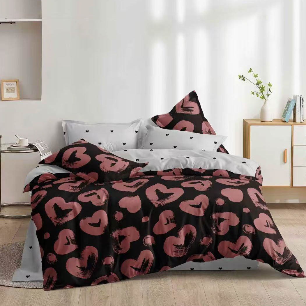 Lenjerie pat dublu, bumbac satinat, 4 piese, Negru, Rosu, inimioare