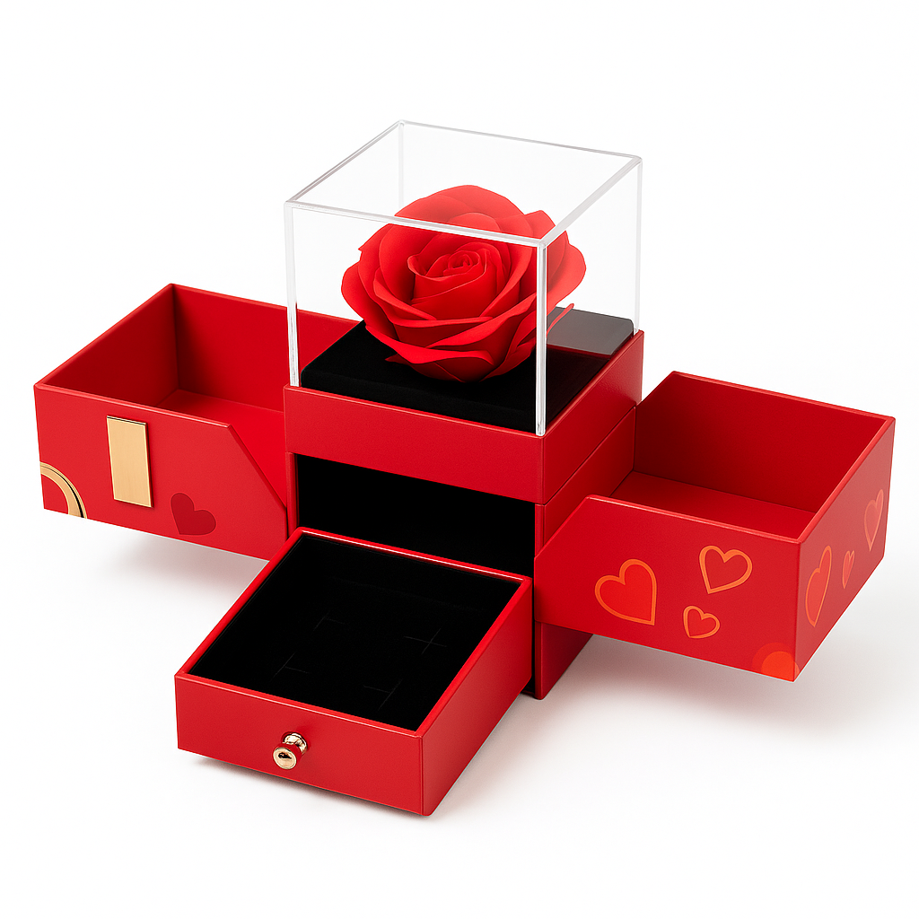 Cutie cadou rosie cu trandafir de sapun in cub transparent si sertare, model premium, 11x9.5x9.5 cm