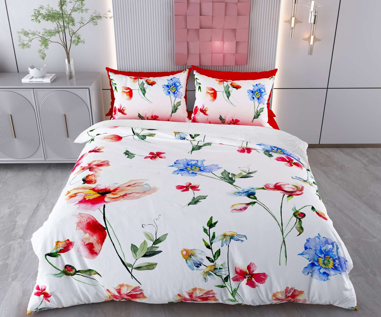Lenjerie de pat dubla Super King (FR), 3 piese, Lessentiel Maison, Floser, Bumbac;Poliester, Alb / Roșu / Verde / Albastru