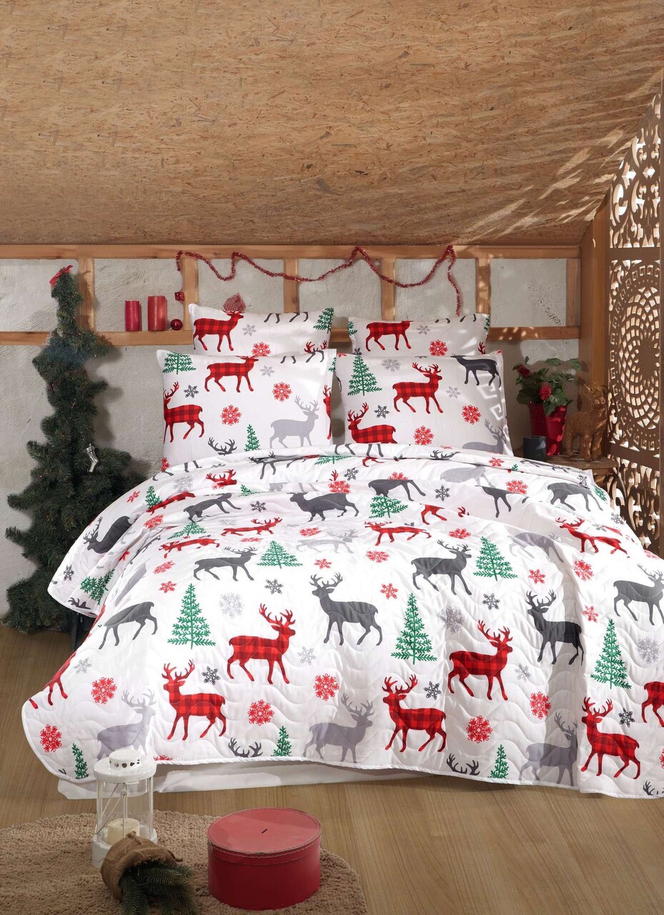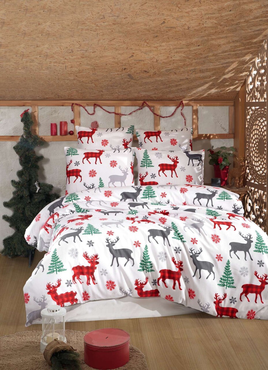 Lenjerie de pat dubla King (EU) (ES), 3 piese, Lessentiel Maison, Geyik, Alb / Roșu / Verde / Gri